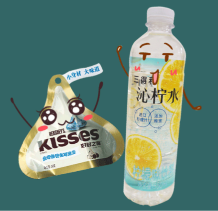 一堆是好利CP,分别是【好时巧克力】和【三得利沁柠水】,前者负责甜蜜,后者只管清新。