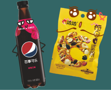 一对是百洽CP,分别是【百事可乐树莓味】和【洽洽坚果】组成,前者作为网红界的新新人类颇受欢迎,后者也是不甘落后的美食宠儿。