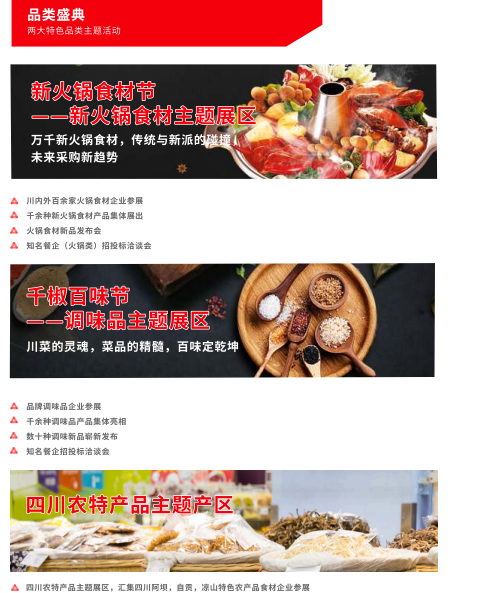 新火锅食材主题展区:作为本届最大的主题展区,川内外百余家火锅食材企业参展,千余种新火锅食材产品集体展出,还有火锅食材新品发布会,知名餐企(火锅类)招投标洽谈会。