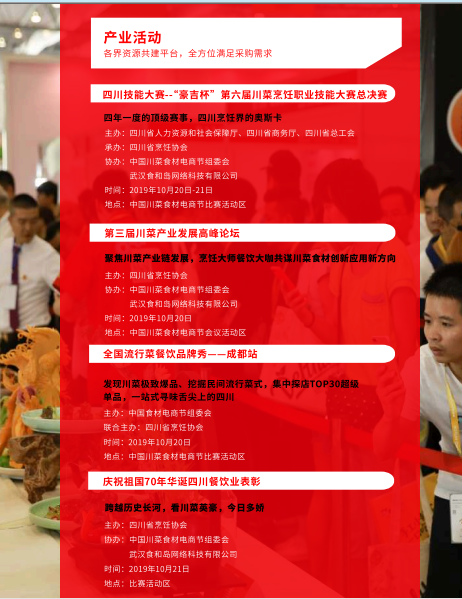 与2019年第四届川菜食材电商节同期举办的还有2019中国餐饮食材展览会、2019中国餐饮设备及酒店用品展览会、2019中国食材生产加工设备展览会、2019年中国餐饮调味品展览会、2019中国餐饮服务展览会。为促进川菜产业链、供应链的发展,为川菜文化的宣传推广、各地饮食文化传承与交流搭建了平台;对弘扬中华美食文化、增强全行业的凝聚力、促进全行业健康可持续发展将起到非常积极的推动作用。