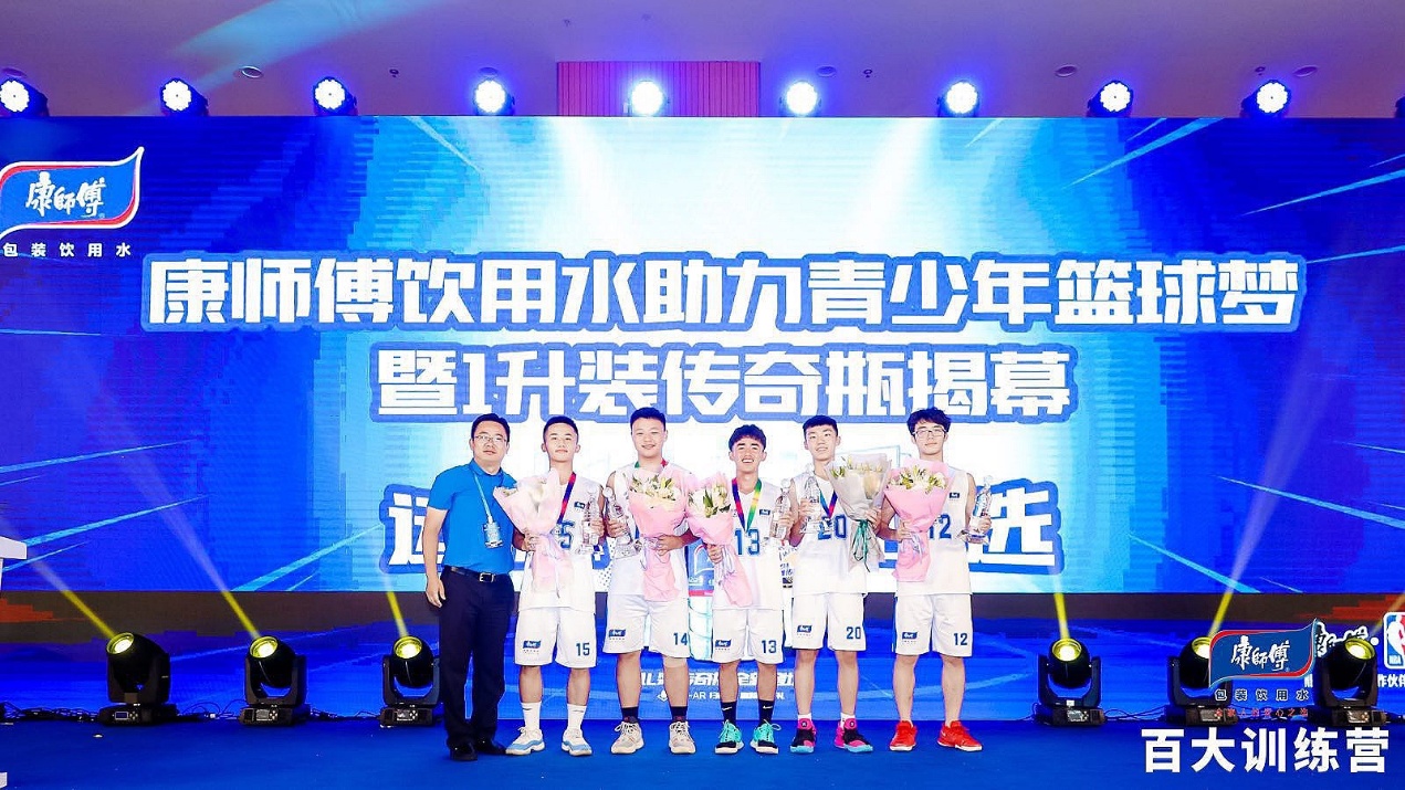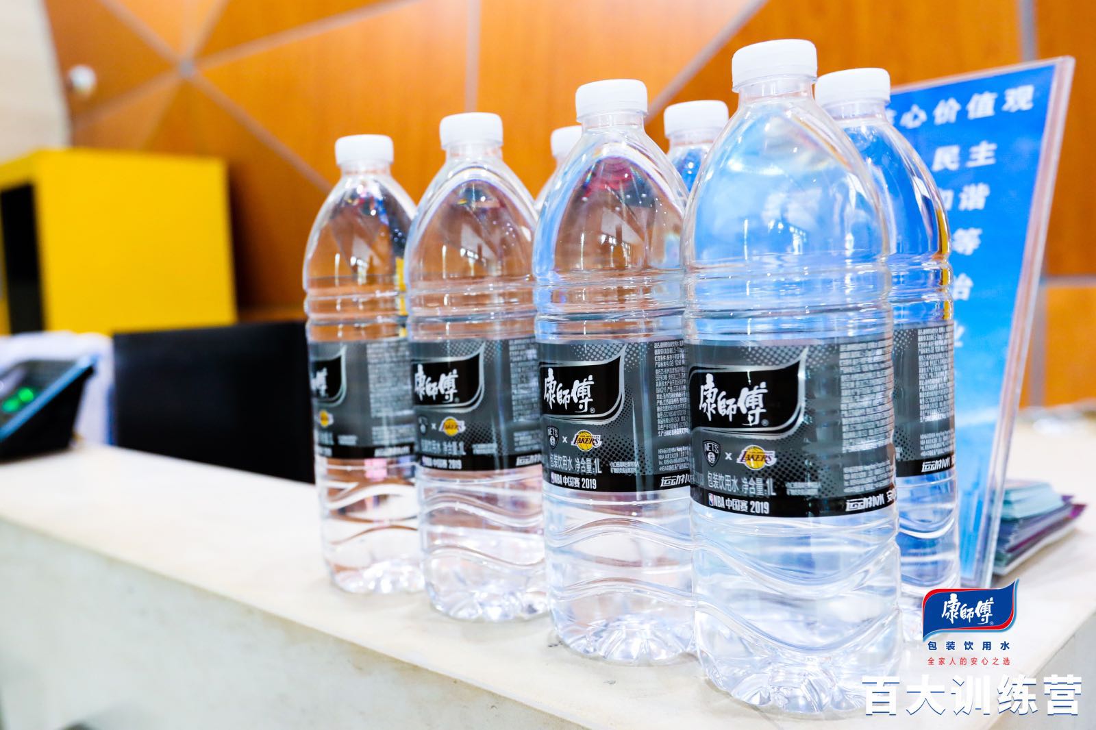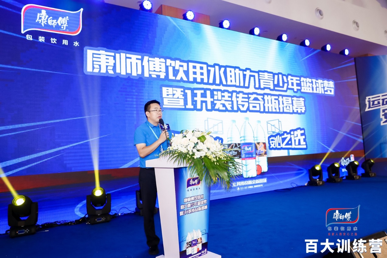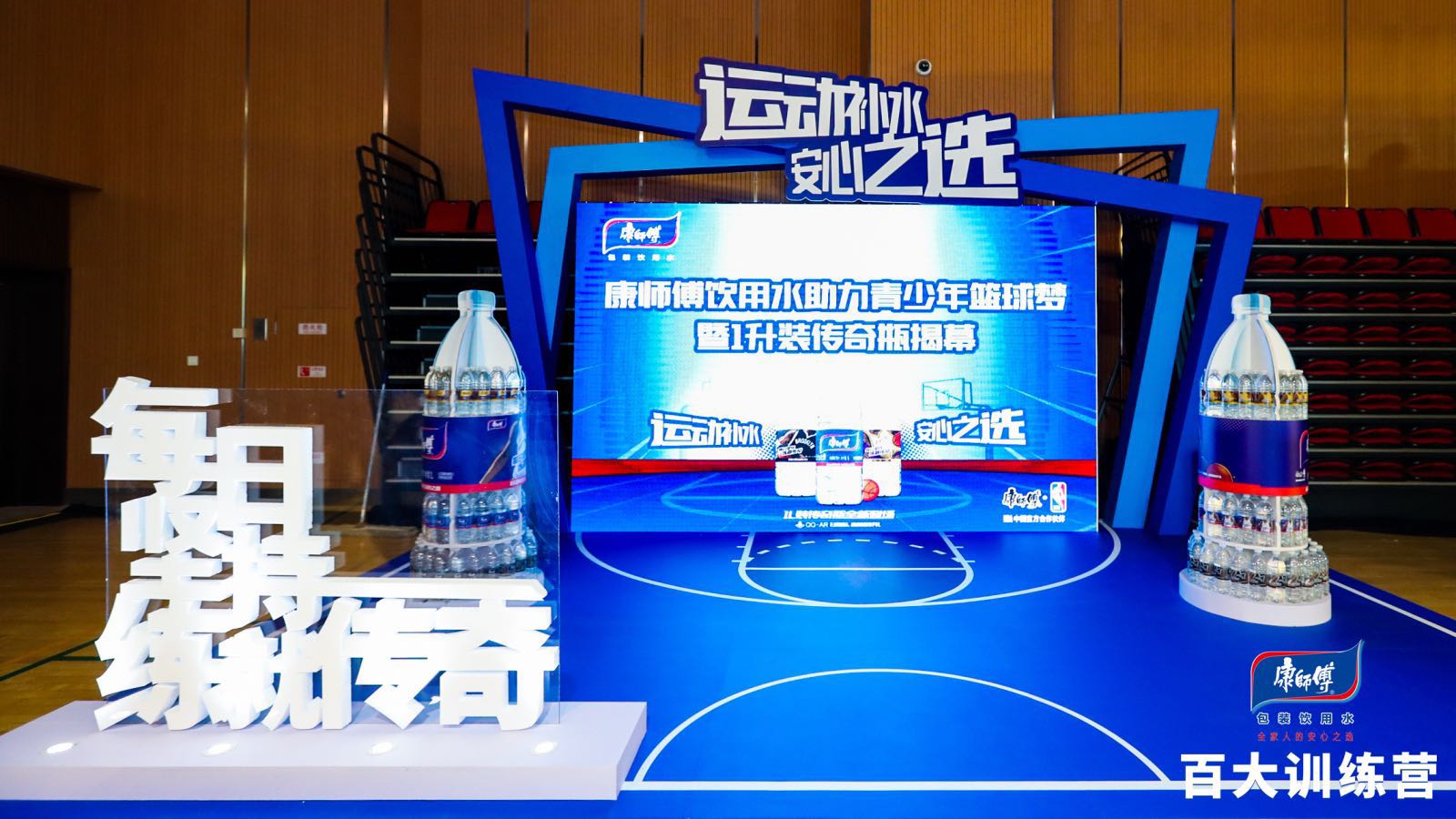 在传奇瓶启动仪式上,康师傅高层及现场大咖们一同将1L装康水倒入启动装置中,装置启动后一起举起手中传奇瓶共同合影留念。随后主持人邀请全场观众观看百大联盟篮球训练营精彩回顾视频,近百场地方营、近十场城市营的小球员们用拼搏和汗水浇灌属于自己的篮球年华,赢得了在场观众的阵阵掌声。