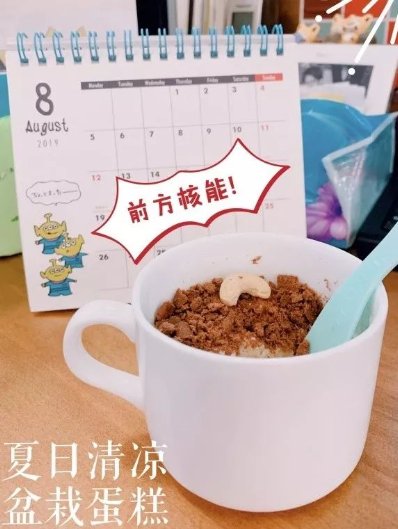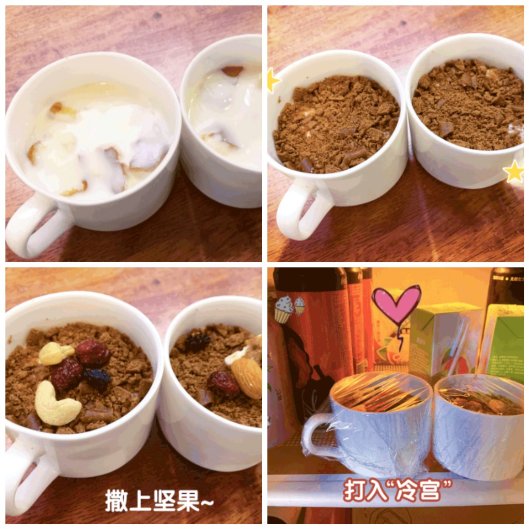 准备好材料,就可以开始制作甜品:糕底由撕碎后的蛋糕和酸甜可口的酸奶组成。先将撕碎的蛋糕铺满马克杯底,再倒入满满的酸奶。然后用明治欣欣杯中的饼干敲碎制作成盆栽土,最后撒入坚果放进冰箱中冷藏。这样简单的DIY步骤之后,一杯清凉又可口的盆栽蛋糕就大功告成了!