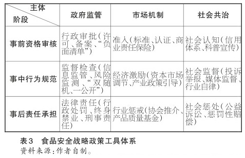 第三,共建共治共享的社会治理体系。党的十九大报告指出,打造共建共治共享的社会治理格局。食品安全风险多元性决定了动员社会各方力量共治的必要性,实现从“少数人管多数人”向“多数人盯少数人”的转变,具体包括格局共建、风险共治、成果共享三个层次。尤其是要提高社会治理社会化、法治化、智能化、专业化水平,最终实现食品安全与高质量发展共享,食品安全与市场秩序共享以及食品安全与社会和谐共享。上述三大体系的内在逻辑关联是:以“大监管”构建统一市场,以“大市场”提升产业素质和监管效能,以“大治理”应对现代市场与产业的复杂风险。食品安全战略的具体政策工具如下(见表3)。