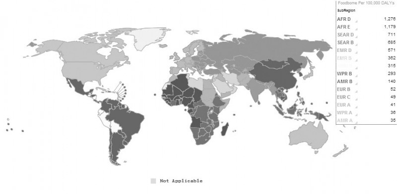 图3 2015年全球食源性疾病负担分布(单位:伤残调整生命年) 资料来源:世界卫生组织网站,https://extranet.who.int/ sree/Reports?op=vs&path=/WHO_HQ_Reports/G36/PROD/ EXT/FoodborneDiseaseBurden