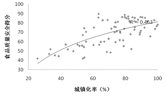 研究表明,食品安全问题与所在国家和地区城镇化进程态势密不可分,在农业人口数量下降到总人口50%以下时集中爆发。由于“从农田到餐桌”的食品产业链变长,提高了问题发生概率。同样基于数据可获得性,研究用对数回归分析了2015年全球73个主要国家(地区)城镇化率与食品质量安全得分的相关性(见图2),其拟合优度(R2)为0.46。可以看到,城镇化率超过50%后数据离散度明显提高,风险波动性增大;超过80%后开始收敛,即不确定性减弱。例如19世纪中期美国北方城市化发展迅速,周边农村鲜奶供应跟不上大量涌入城市的人口,不法商人通过催乳、掺假手段生产“儿童卫生奶”。最后,终于爆发1858年纽约“泔水奶”事件,导致5.3万名婴儿受感染,1年内有近8000名儿童死亡。英国、德国、日本工业化进程中的食品安全问题同样经历了类似的过程。