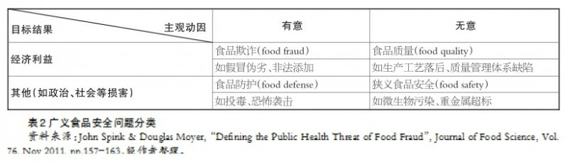 表2广义食品安全问题分类 资料来源:John Spink & Douglas Moyer,“Defining the Public Health Threat of Food Fraud”, Journal of Food Science, Vol. 76, Nov 2011, pp.157-163,经作者整理。