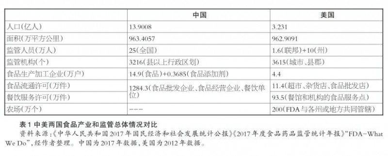 与“大产业”和广阔地理区域形成鲜明对比的是,我国食品安全监管体系整体薄弱。通过梳理中美两国食品产业和监管总体情况(见表1),我们发现三方面显著差距。一是我国每万人口监管人员比例约为1.8,美国则高达3.6,监管资源基础不同。二是我国食品经营环节市场主体超过1280万户,美国仅105万户,监管对象规模存在差异。三是监管机构平均承担的监管任务,我国远多于美国。在这种监管资源和监管能力的硬约束下,静态行政许可和“运动式”专项整治成为主要政策手段。由于“重审批、轻监管”的监管风格导致审管脱节,审批往往在现实中异化为政府对企业的背书和包办,进而制约日常监督检查有效性。