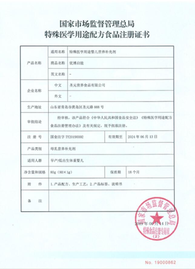 此次,圣元成为国内首家获得特殊医学用途婴儿营养补充剂注册证书的企业,进一步巩固了圣元集团作为中国特殊医学用途配方食品领域的先驱地位,也是圣元特医团队十年磨一剑,最终绽放出的成果。优博启能特殊医学用途婴儿营养补充剂的生产、上市,将为早产儿打造良好的人生开端。