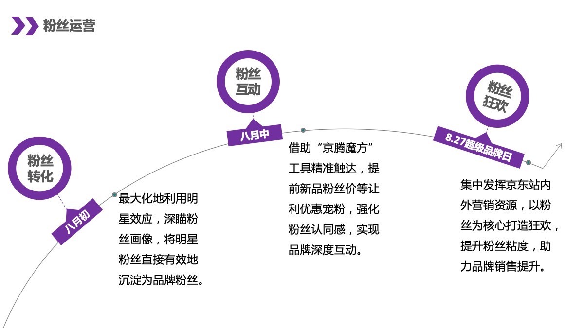 作为蒙牛在京东首次大规模粉丝营销活动,京东首先针对活跃粉丝进行有针对性的营销,调动活跃粉丝的热情;随着活动节点的临近,将营销的投放重心转向沉睡粉丝,通过站内外多种形式的精准沟通,将沉睡粉丝唤醒;在8月27日蒙牛京东超级品牌日当天,对活跃和忠实粉丝用户持续施加影响,完成这部分人群的“二次转化”,同时通过各类利益点推动被唤醒的沉睡和流失粉丝用户的购买转化。