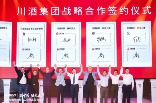 发布会最后,川酒集团还和上海保利酒业有限公司、壹玖壹玖酒类平台科技股份有限公司、四川华龙祥酒业有限公司、每日经济新闻智库、凤凰卫视有限公司、国宝人寿保险股份有限公司、四川全兴酒业有限公司、环球佳酿酒业有限公司签署了战略合作协议。