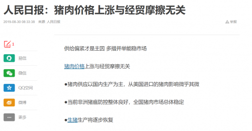 近期,农业农村部畜牧兽医局监测信息处处长辛国昌在人民日报上为 “中美贸易摩擦造成”猪肉价格上涨进行了辟谣:“从美国进口的猪肉,对我国猪肉市场供应影响微乎其微。当前猪肉价格上涨与中美经贸摩擦无关。从总量上看,10年来,我国猪肉进口量总体呈增加趋势,但主要起到供需余缺调节作用,进口猪肉占国内猪肉产量的比重不超过3%,猪肉供应以国内生产为主”