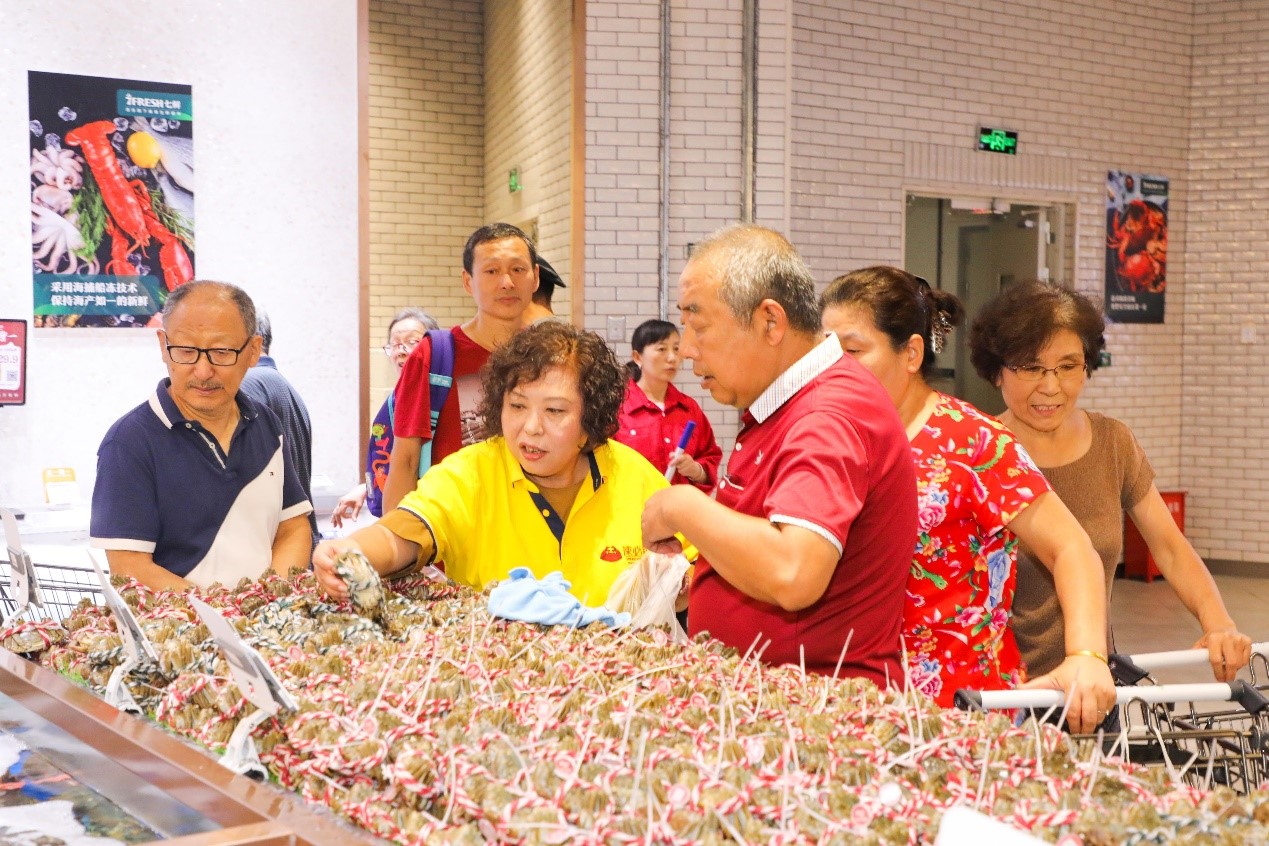 最会吃的消费者都集中到生鲜水产区了。正所谓靠山吃山,靠海吃海,从小长在海河边的天津人,对于生鲜水产可谓再熟悉不过了。10点一开门,许多消费者蜂拥至生鲜水产区,梭子蟹、大闸蟹、冰鲜黄花鱼等时令生鲜,都受到了大家的热情照顾。