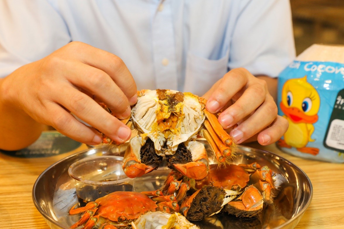 薛先生在店内食用现场烹饪的黄河口大闸蟹