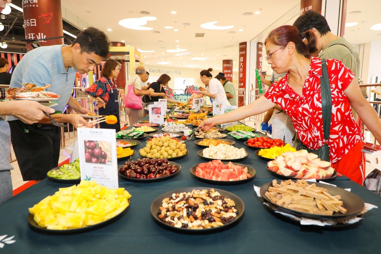 活动现场的美食品鉴活动也吸引了不少慕名而来的消费者,以“鲜、美、特”为主的各类海鲜、水果、烘焙商品应有尽有,消费者凭当天现场购物小票即可参与到现场畅吃。