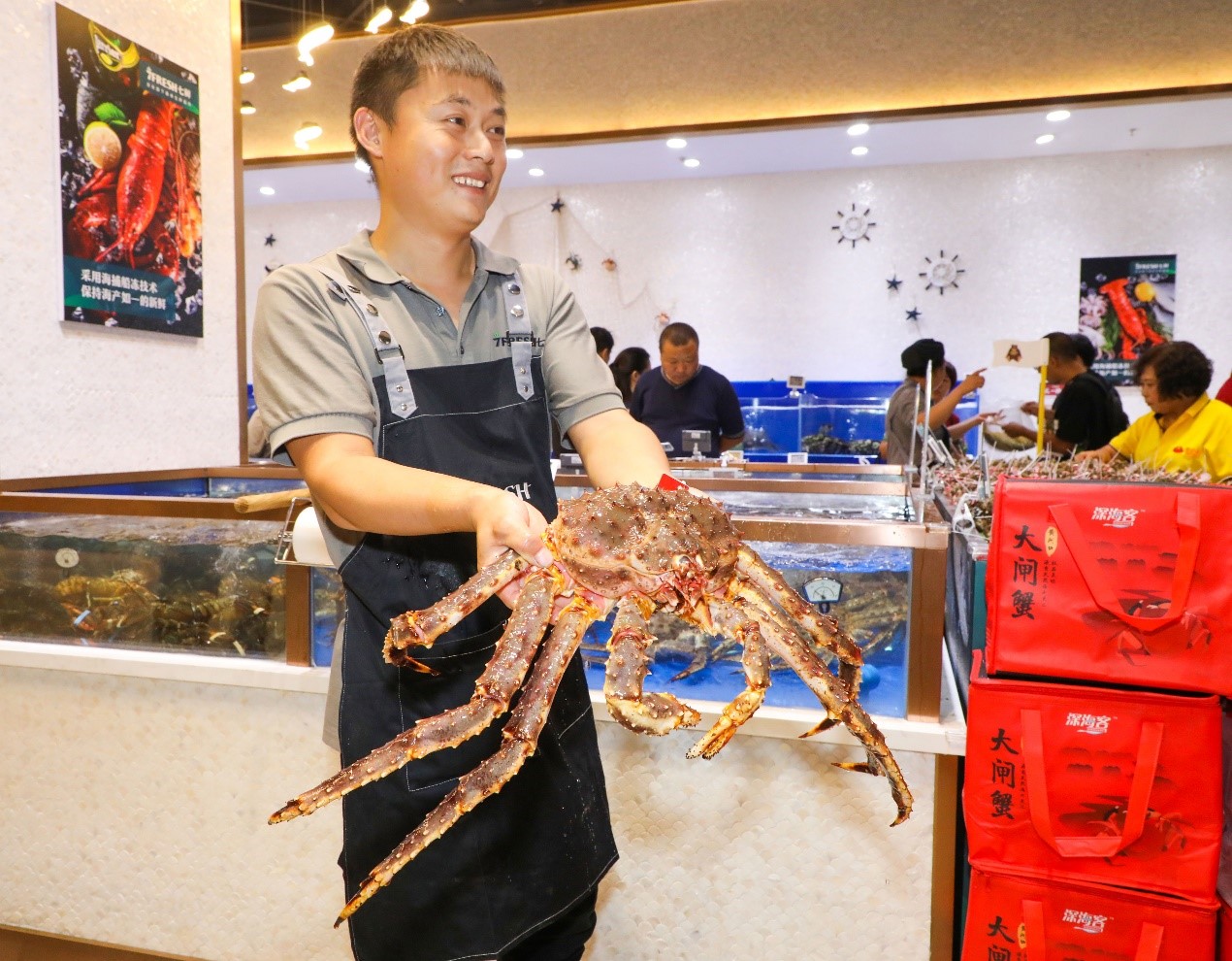 店员展示霸气的帝王蟹