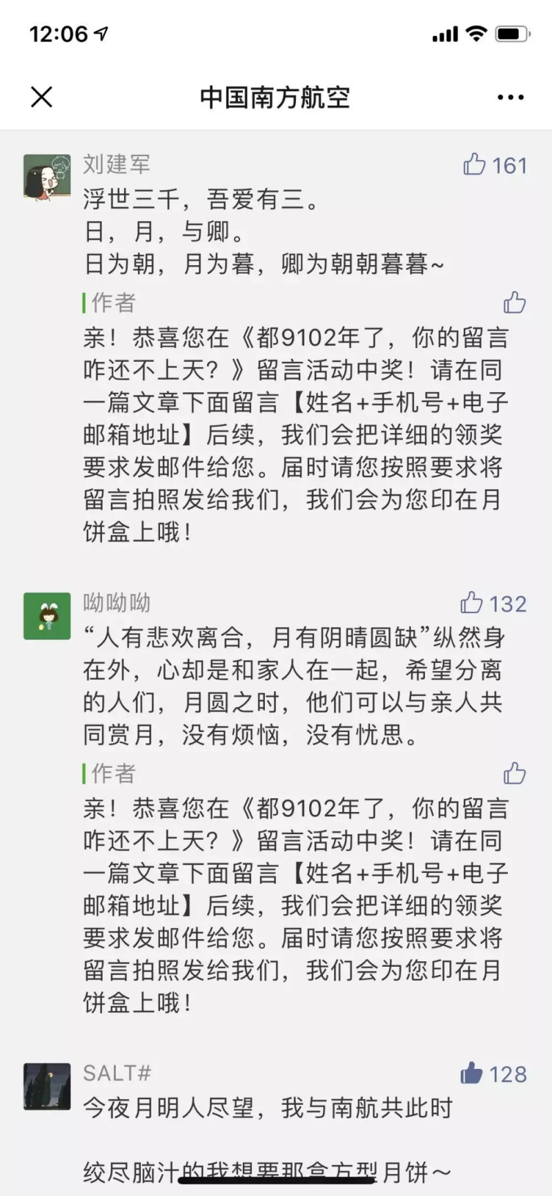 这个中秋节,南航空厨可谓极尽心思,不仅设计了几款颜值与口味并存的月饼,让天上地下的食客们大饱口福,为了更好地给旅客和员工传递中秋情意,今年还准备了形式丰富的活动,有猜灯谜、跨界合作、线下送福利、征集粉丝寄语等等~这些活动引发了众多粉丝的讨论和参与,活动现场一度火爆。这个中秋佳节,南航空厨着实火了一把~