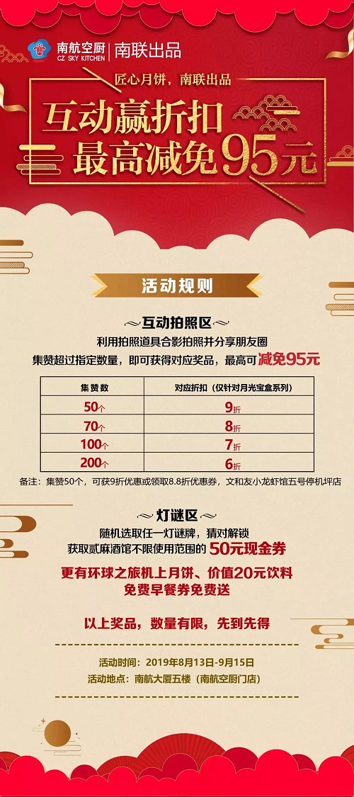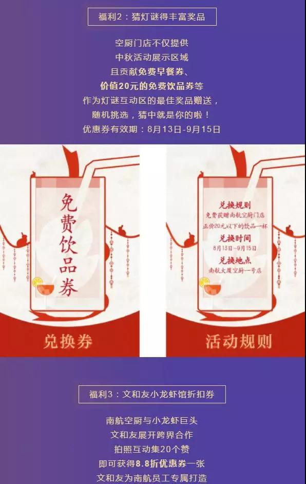 南航空厨公众号率先为这次中秋活动预热造势,公布了连连不断的惊喜福利,有奖猜灯谜,有奖拍照打卡,更有文和友、贰麻酒馆、空厨一号店的超强优惠免费送!公号的宣传也为线下销售吸引了一大批参与者,大大地提高了活动的关注度和参与度!
