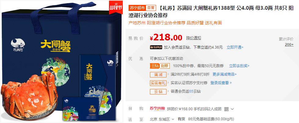 可见,大杂蟹凭借它的鲜嫩多汁,实力征服了所有年龄层,无论送谁都不会错,简直就是中秋送礼的万能公式。而且,苏宁易购还特别推出了生鲜食材满158减20的优惠活动,这么算下来比好多月饼礼盒都便宜,轻松实现大闸蟹自由。