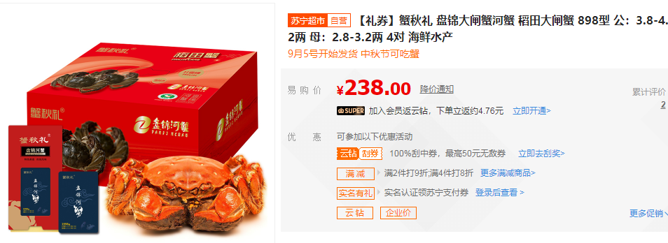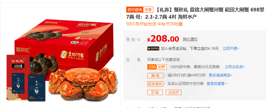 不过让广大吃货伤心的还有一件事,那便是今年中秋节日期较往年提前,而久负盛名的阳澄湖大闸蟹却需要等到节后才会捕捞,想要吃到就只能等到节后了。为此,苏宁特别推出了中秋前可提货的特别定制款、金锦上398型、盘锦河蟹698型产品,助力消费者中秋“尝鲜”。
