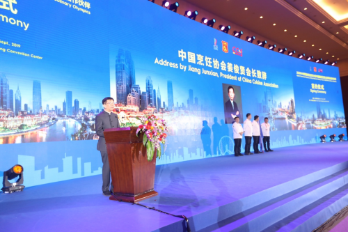 发布会现场,中国烹饪协会会长姜俊贤、益海嘉里餐饮发展市场总监杨滨、益海嘉里天津企业群副总经理张军海,与中国国家烹饪队总教练、中国烹饪大师李彤携中国国家烹饪队成员出席签约仪式。这支队伍由中国烹饪协会组建,经过组织推荐、层层选拔,首先从全国范围内选拔能够代表中国水准的、优秀的、高素质的青年厨师进入集训队,再经过综合考评,挑选其中十人成为正式国家队队员,2020年将出征在德国举办的第25届世界奥林匹克烹饪大赛。