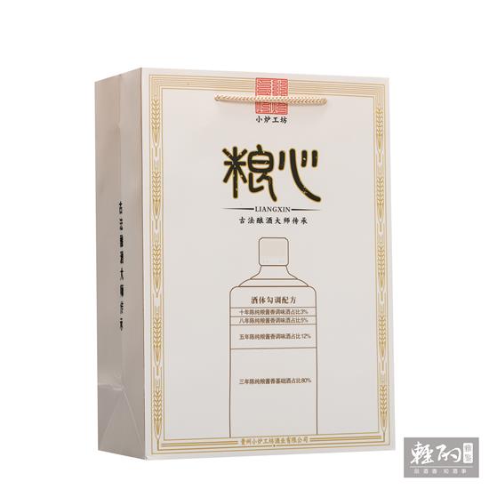仔细端详盒身。正上方品牌名“粮心”,采用起鼓烫金工艺占据C位,其上下两端均作了独特设计。粮心上方是出品方小炉工坊字样,并伴有烫红印章风格,下方标注的“古法酿酒大师传承”字样,彰显着酒体出身的高贵。三者主次分明相辅相成,很是醒目。
