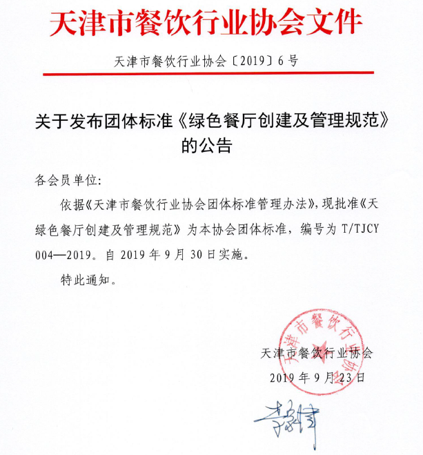 天津市餐饮行业协会关于发布团体标准《绿色餐厅创建及管理规范》的公告