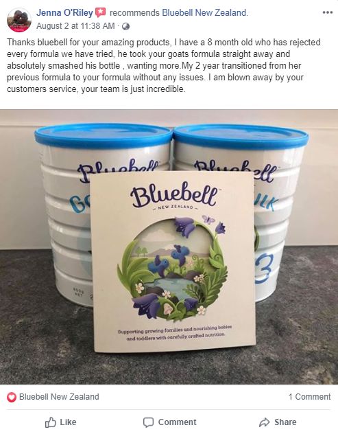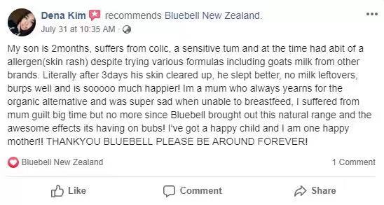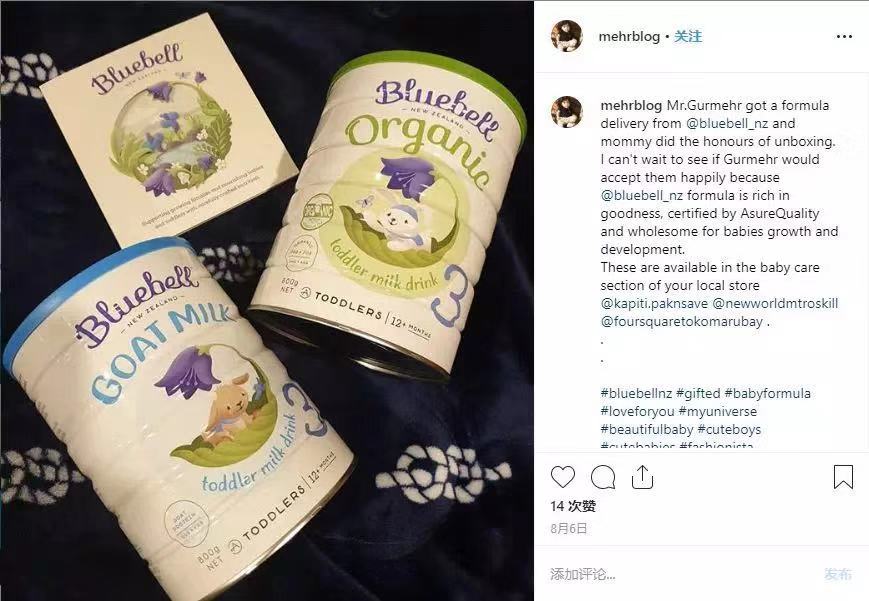 而在Instagram和Facebook上,还可以看到不少新西兰妈妈对Bluebell的赞誉, 表达了喜爱和信赖,她们认为安心可靠的产品品质和新西兰权威的认证是她们选购Bluebell的主要原因。