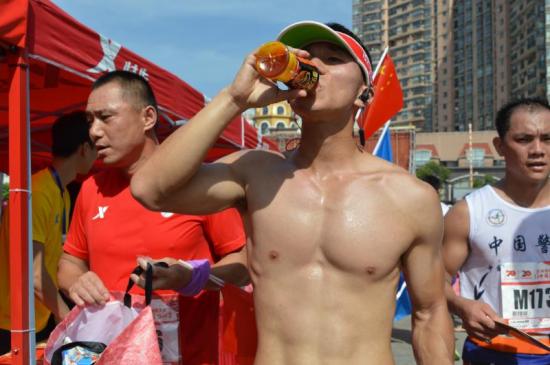 比赛后选手畅饮盼盼豹发力,迅速补充身体流失的能量。