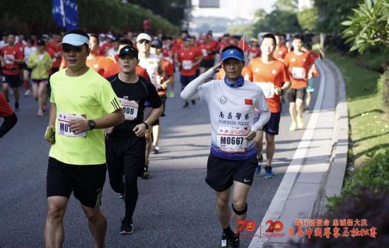 正在比赛中的警察对着镜头敬了个军礼。