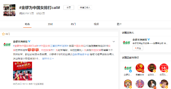 金锣为中国女排打Call 为冠军喝彩