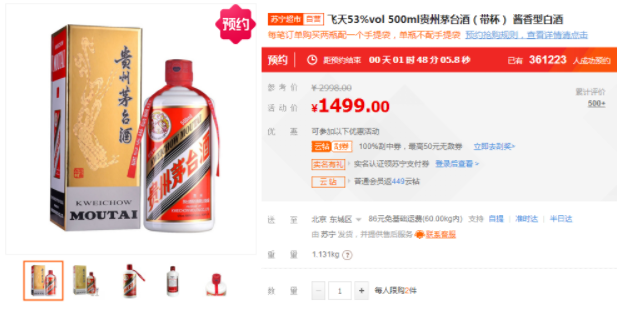 值得一提的是,10月8日上午10点,苏宁易购此前开启预约的1499元的飞天53%vol500ml贵州茅台酒(带杯)酱香型白酒将迎来最终的抢购环节。截至10月7日下午4点多,已有超过36万人成功预约。