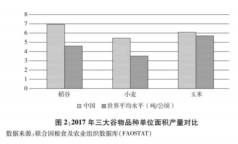 ——单产显著提高。2010年平均每公顷粮食产量突破5000公斤。2018年达到5621公斤,比1996年的4483公斤增加了1138公斤,增长25%以上。2017年稻谷、小麦、玉米的每公顷产量分别为6916.9公斤、5481.2公斤、6110.3公斤,较1996年分别增长11.3%、46.8%、17.4%,比世界平均水平分别高50.1%、55.2%、6.2%。