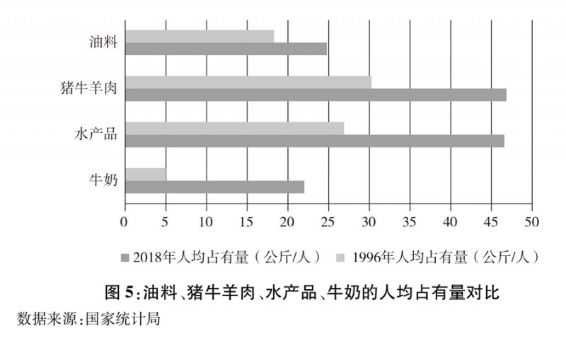 图5:油料、猪牛羊肉、水产品、牛奶的人均占有量对比 新华社发