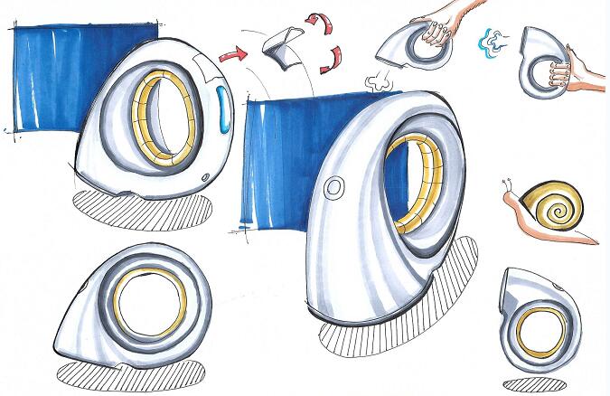SURE挂烫机外形宛如蜗牛壳,蜗牛壳是蜗牛永久居住的房子,用来保护柔软的身体和内脏。设计师寄语:旅行的意义——带着房子去旅行,SURE挂烫机在旅行中充当着衣服的“房子”,保护柔软的衣服不受伤害,依旧平整光滑如最初。