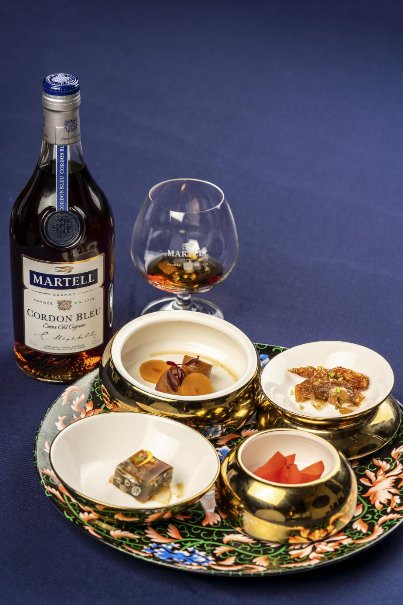 前菜一出既点出了南北融合的主题——是由吴嵘呈现的特色闽南小吃土笋冻、套肠、五香卷,辅以北方元素的蘸料,既是精致华美的视觉盛宴,更是丰富独特的味蕾享受。作为最应季的食材,干煎红树林奄仔蟹和黄坛子手拆陈皮奄仔蟹配佛跳墙,味道融合而不突兀,突显了两位主厨的深厚功力和创新技艺。其他菜品还包括由吴嵘烹制的意大利20年樱桃醋溜海参,由段誉呈现的九月丹桂糟溜闽东大黄鱼,皆为南北食材和味道的碰撞与融合。搭配菜品的马爹利蓝带以及马爹利蓝带傲创其精致细腻的花香、丰富柔润的口感和馥郁醇香的酒液,为来宾呈现了更加多元化、深层次的美味。