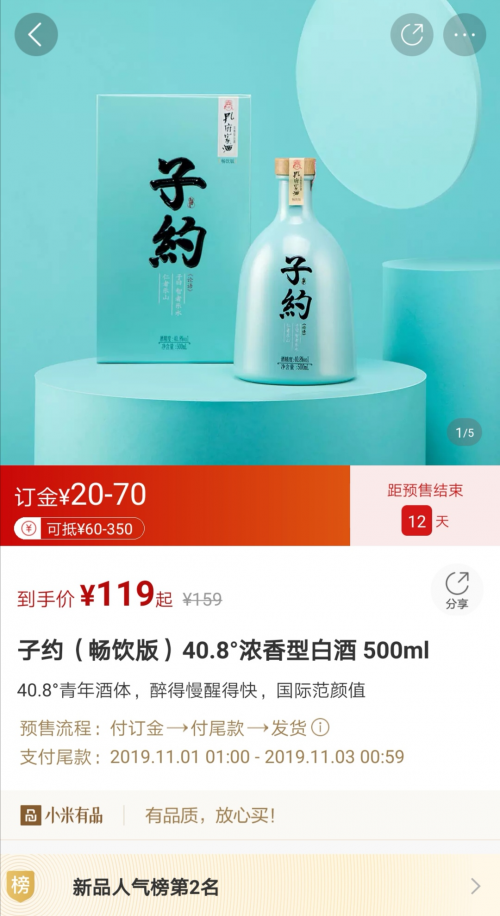 10月19日,孔府家酒子约Ⅴ畅饮版如约上线小米有品预售。据悉,本次上线子约Ⅴ畅饮版是子约第五代产品,亦是2019年的收官之作,子约Ⅴ畅饮版颜色选用“天青色”,酒体选择超百次调配40.8°的“黄金酒体”。子约Ⅴ畅饮版定价159元,在预售期间(预售截止时间为10月31日)采用订金膨胀的方式回馈有品用户,上线当天预售火爆,助推子约力压舍得米兰国际时装周纪念版,喜提新品人气榜酒类冠军。