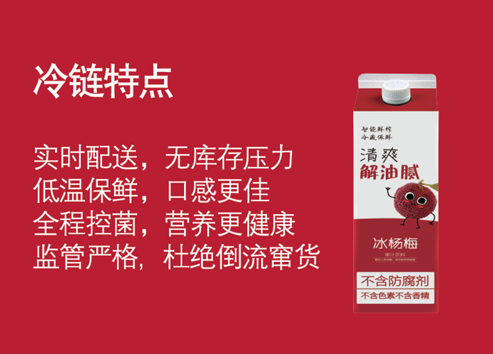 此外,本无尘杨梅汁还是一杯纯净鲜榨的杨梅汁,只含杨梅、水和白砂糖,不添加任何香精、防腐剂、色素和食用酸。每杯本无尘杨梅原汁含量≥50%,富含有多种有机酸、维生素C及矿物质等。低温灌装、科技冰、保温箱、保温袋、冷藏车……完善的冷链体系设计为本无尘杨梅汁保教护航,全程智能冷冻,高效锁鲜,确保杨梅汁新鲜抵达,最大限度地保留杨梅的营养成分和纯正口感。