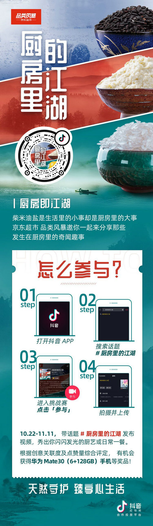 京东超市粮油品类风暴邀您一起来参加#厨房里的江湖抖音挑战赛 。打开抖音,拍出属于你的曼妙食光,就有机会赢得华为Mate30等大奖!我在厨房里的江湖等你来战!