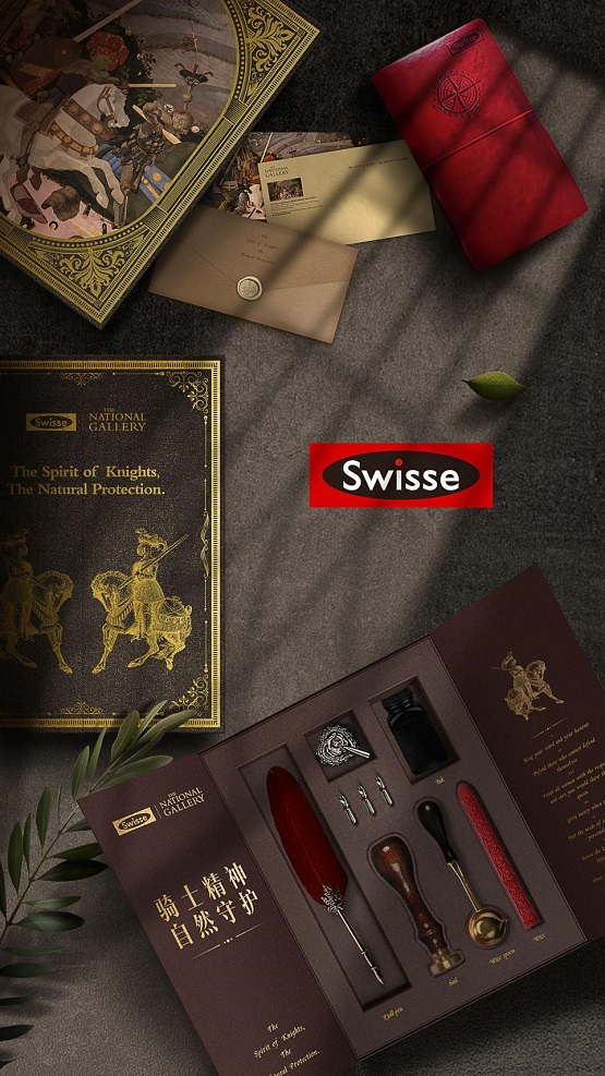Swisse“骑士精神”礼盒内含羽毛笔套件、火漆印章套件、明信片、信封、手账本等,无一不彰显着“骑士身份”的象征,鼓励现代人在追求与守护梦想的时候,也别忘了保护自己的身体,同时呼吁女性给予为家庭辛苦付出的骑士应得的鼓励支持。