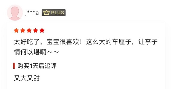 除此之外,京东这批智利车厘子,从新鲜采摘、二次分拣、自动化分装,到全程冷链飞往京东,全程仅72个小时,果子的新鲜度非常好,不仅品相好,果蒂部分翠绿发黄,果实色泽艳红发亮,吃起来还皮脆肉软,充满了新鲜水果的鲜甜味,获得了消费者的一致点赞。品相好,味道甜,是这款车厘子获得最多的评价。