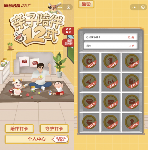 节目外,海普诺凯1897紧密结合综艺传播热点,采用矩阵联动玩法,在社交传播中进行二次发酵。线上以节目内容频繁释放品牌互动,线下打造互动小程序“亲子陪伴12式”体现陪伴特点,通过线上下交互传播方式,充分实现海普诺凯1897品牌声量的全方位扩散。