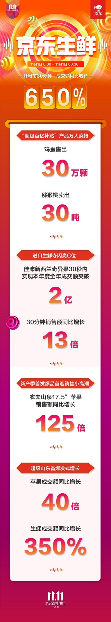 超级省山东站也迎来销售小高潮。继10月25日京东与山东省商务厅达成战略合作,并启动京东生鲜“超级省”计划以来,山东产品热度持续升温,苹果开售半小时成交额同比增长40倍,成为山东省成交额最高的生鲜品类,生蚝成交额则同比增长了350%。