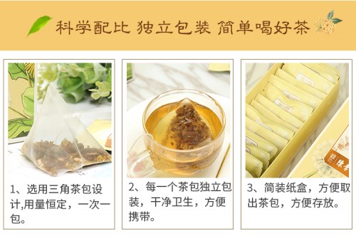花茶系列则是经过专业人员科学配比原料,锁住营养更好吸收,所以便选用三角茶包设计,用量恒定,一次一包。每一个茶包独立包装干净卫生,方便携带。简装纸盒的设计,干净卫生易存放。