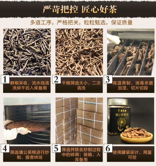 陈李济采收长白山新鲜蒲公英根,设置工厂就地取材加工,保证营养不流失。市面上很多蒲公英根切片后营养流失严重,所以陈李济将蒲公英根做切段处理,受热均匀,保留营养,而且更易保存。从筛选、清洗—蒸制、切段—炒制、提香烘焙等多道工序都严格把关,粒粒甄选,保证产品质量。