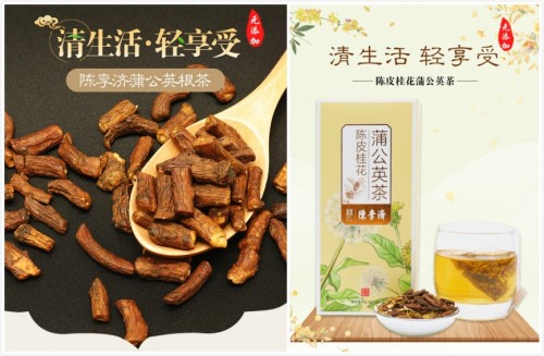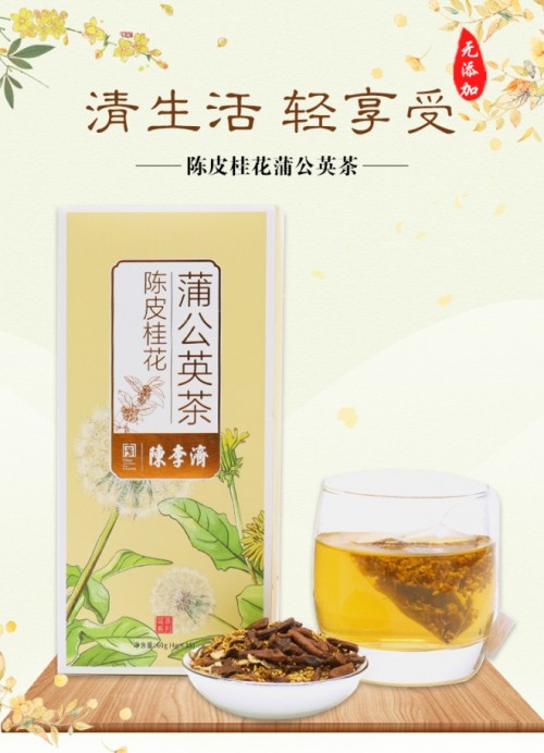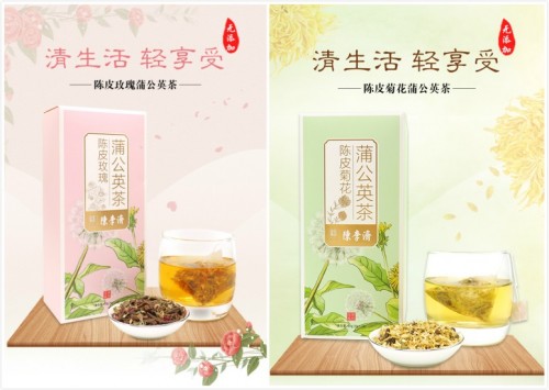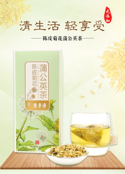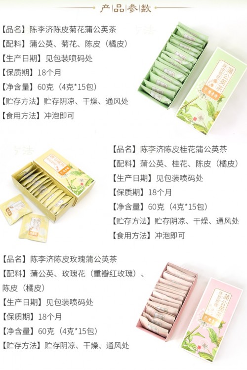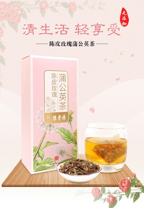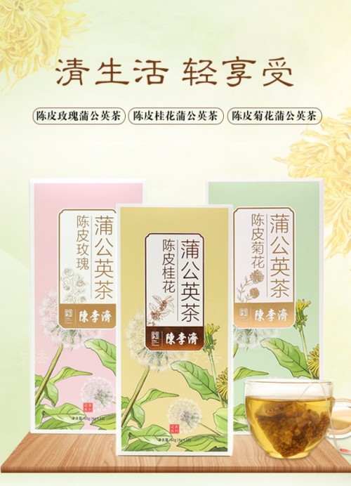 因蒲公英有清热解毒,护肝等作用,陈李济优选长白山蒲公英根为主料,桂林桂花、黄山贡菊和平阴玫瑰为茶香的基调,加入陈皮运化调和。将原朵花苞与新会陈皮做破碎处理,出味更快,更易人体吸收。成为了三款风味独特的花茶。