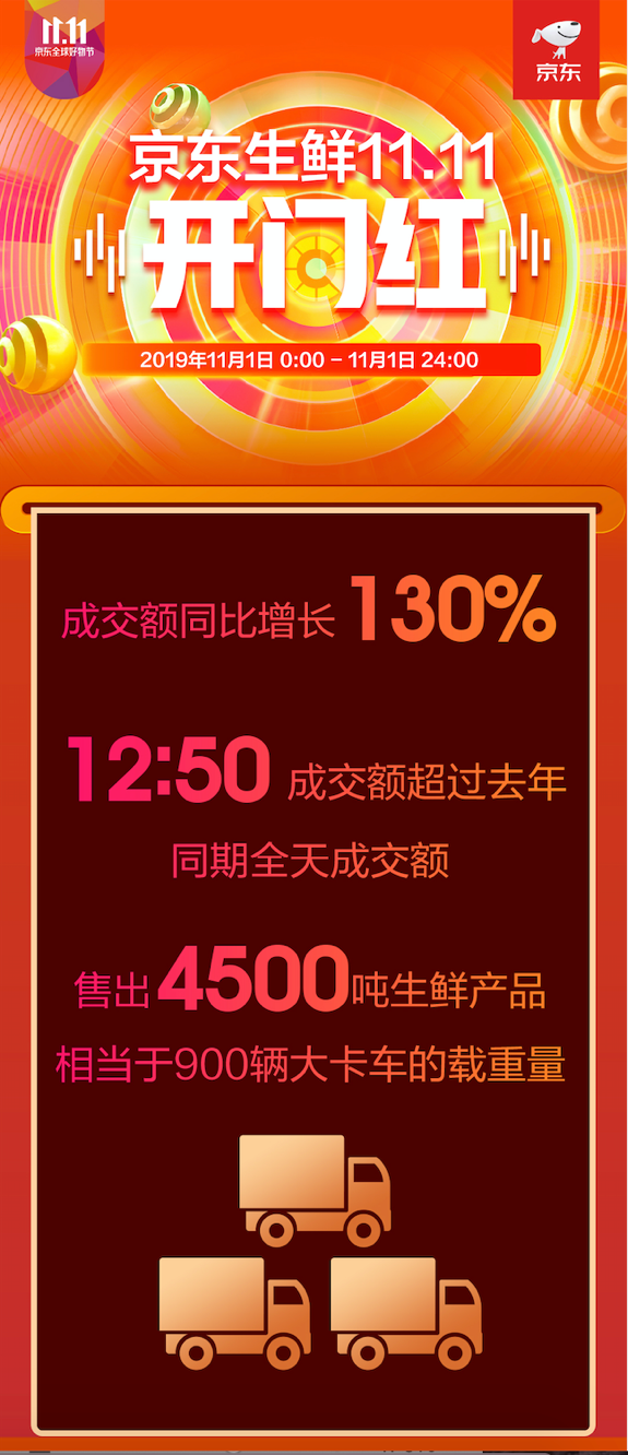 京东11.11全球好物节正在火热进行中,在11月1日当天,京东生鲜斩获了喜人战绩,当日成交额与去年同期相比增长130%,迎来开门红。