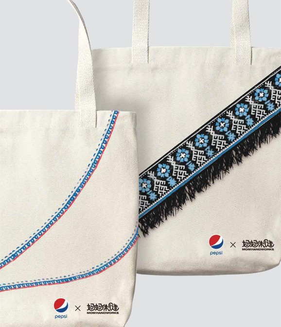 如何与年轻圈层有更多联系?百事可乐把品牌精神延续到文化层面。值得关注的是,2019百事盖念店打出了“与原创联名”的口号,平台重点跨界回力、凤凰、红双喜这样代表中国原创力量的国民品牌,以热爱助推经典新生。同时,盖念店还上线了与妇基会“妈妈制造”项目联名的潮流环保袋,潮袋上装饰了瑶绣彩带,传统刺绣工艺与现代年轻生活方式得以交汇。百事认为,通过该项产品一方面能够为热爱注入千年原创“源”力,另一方面对非遗技艺的可持续推广也有助益。