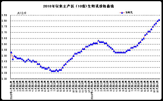 生鲜乳价格。内蒙古、河北等10个奶牛主产省(区)生鲜乳平均价格3.81元/公斤,比前一周上涨0.3%,同比上涨7.9%。