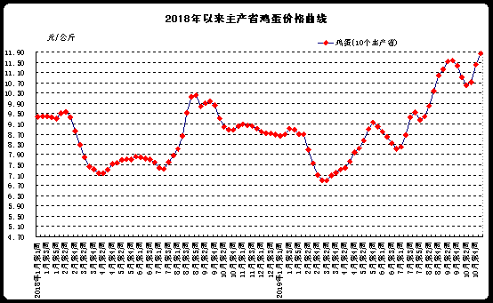 鸡蛋价格。河北、辽宁等10个主产省份鸡蛋平均价格11.84元/公斤,比前一周上涨3.8%,同比上涨31.4%。全国活鸡平均价格25.47元/公斤,比前一周上涨2.7%,同比上涨31.0%;白条鸡平均价格26.59元/公斤,比前一周上涨3.7%,同比上涨34.3%。商品代蛋雏鸡平均价格5.03元/只,比前一周上涨3.7%,同比上涨47.1%;商品代肉雏鸡平均价格7.20元/只,比前一周上涨4.0%,同比上涨86.5%。