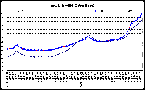 牛羊价格。全国牛肉平均价格81.64元/公斤,比前一周上涨1.1%,同比上涨23.1%。河北、辽宁、吉林、山东和河南等主产省份牛肉平均价格73.52元/公斤,比前一周上涨1.0%;上海、浙江、福建、广东和江苏等省份平均价格96.51元/公斤,比前一周上涨1.0%。全国羊肉平均价格78.67元/公斤,比前一周上涨1.0%,同比上涨22.4%。河北、内蒙古、山东、河南和新疆等主产省份羊肉平均价格75.33元/公斤,比前一周上涨0.9%;上海、浙江、福建、江西和广东等省份平均价格83.06元/公斤,比前一周上涨0.7%。